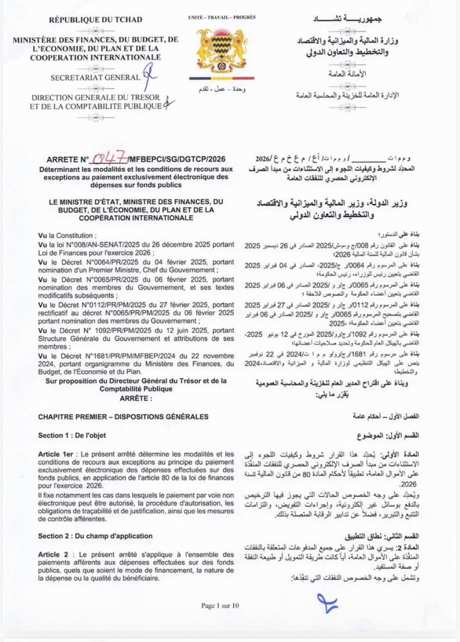 ARRETE N°047-2026 Déterminant les modalités et les conditions de recours aux exceptions au paiement exclusivement électronique des dépenses sur fonds publics
