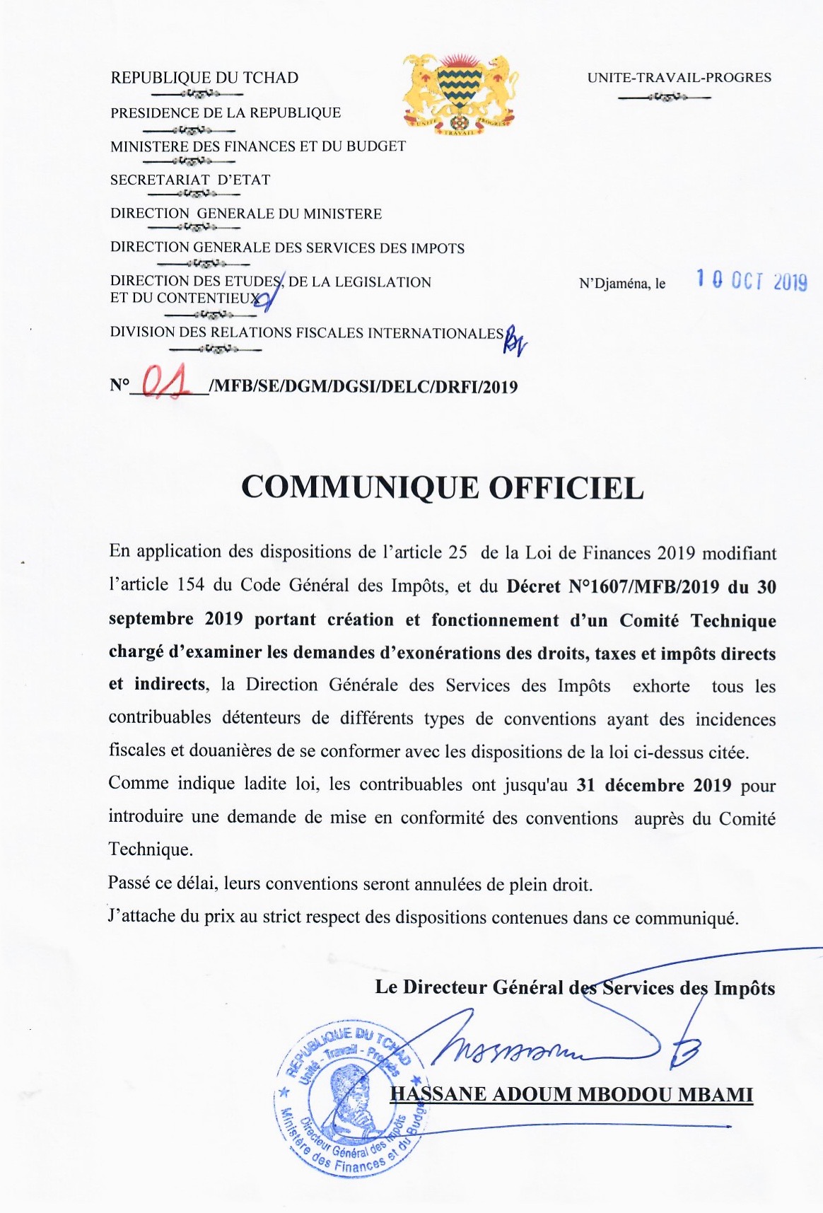 COMMUNIQUE OFFICIEL DE LA DIRECTION GENERALE DES SERVICES DES IMPOTS